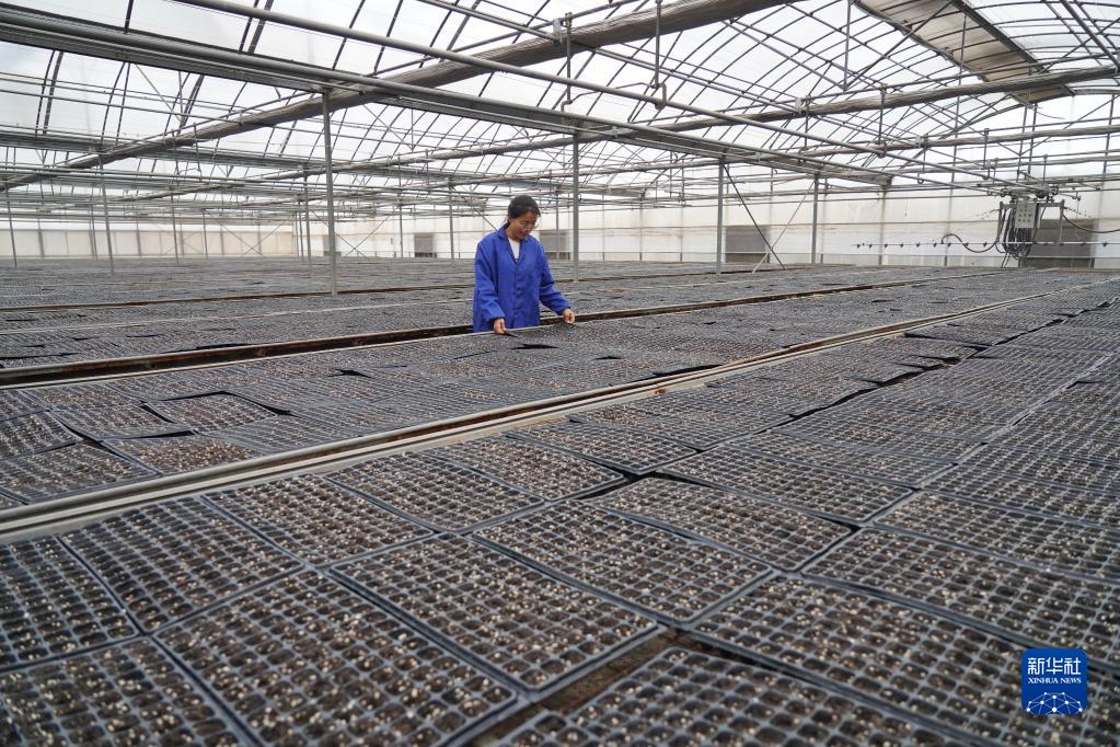 2月17日,张莎莎在连栋育苗温室内查看秧苗长势。