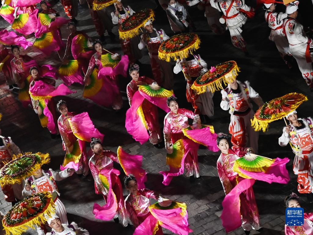 演员在榆林老街非遗大集开集仪式上表演秧歌腰鼓(2月17日摄)。
