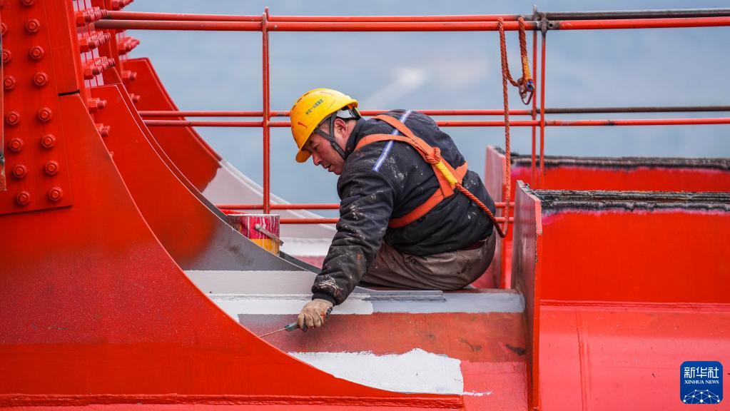 中交一公局工人在德余高速乌江特大桥进行施工(2月16日摄)。