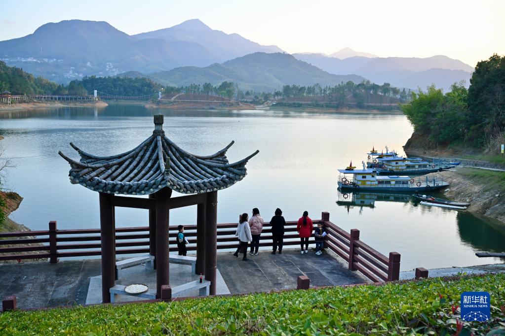 小沧畲族乡居民在湖边休闲(2月16日摄)。