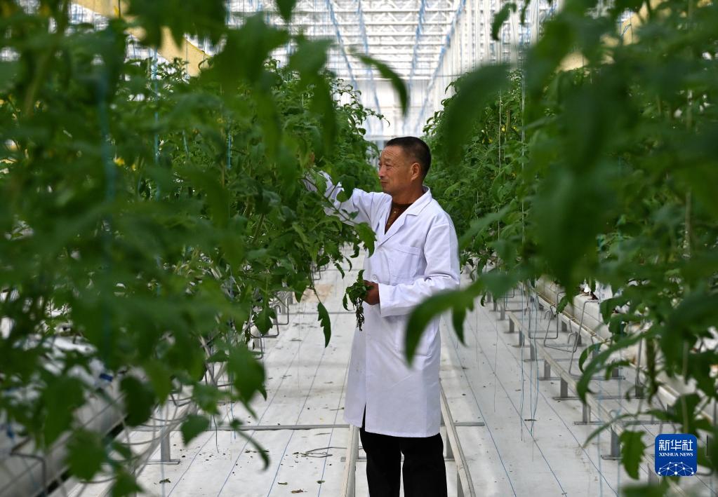 在兰考县仪封镇水木焦桐都市农业综合体项目车间里,技术人员在查看番茄苗长势(2月16日摄)。