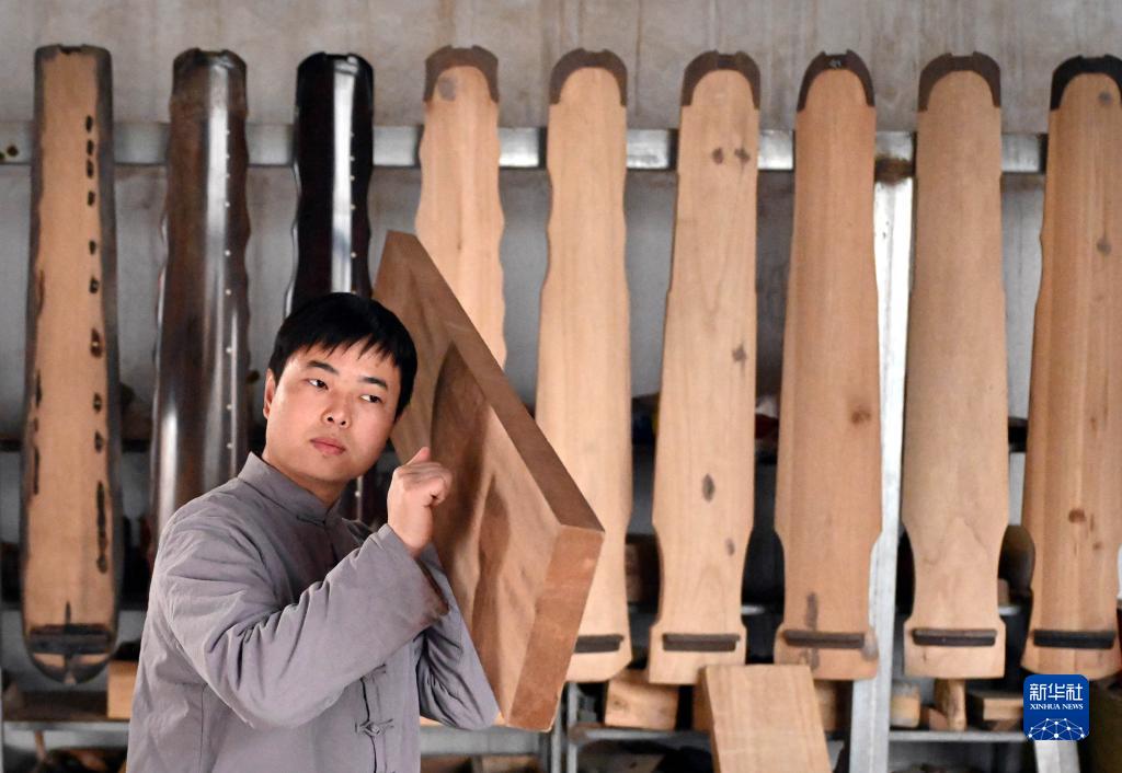 在兰考县堌阳镇徐场村墨武琴坊的古琴制作车间里,斫琴师徐亚冲通过叩击判断板材的质量(2月16日摄)。