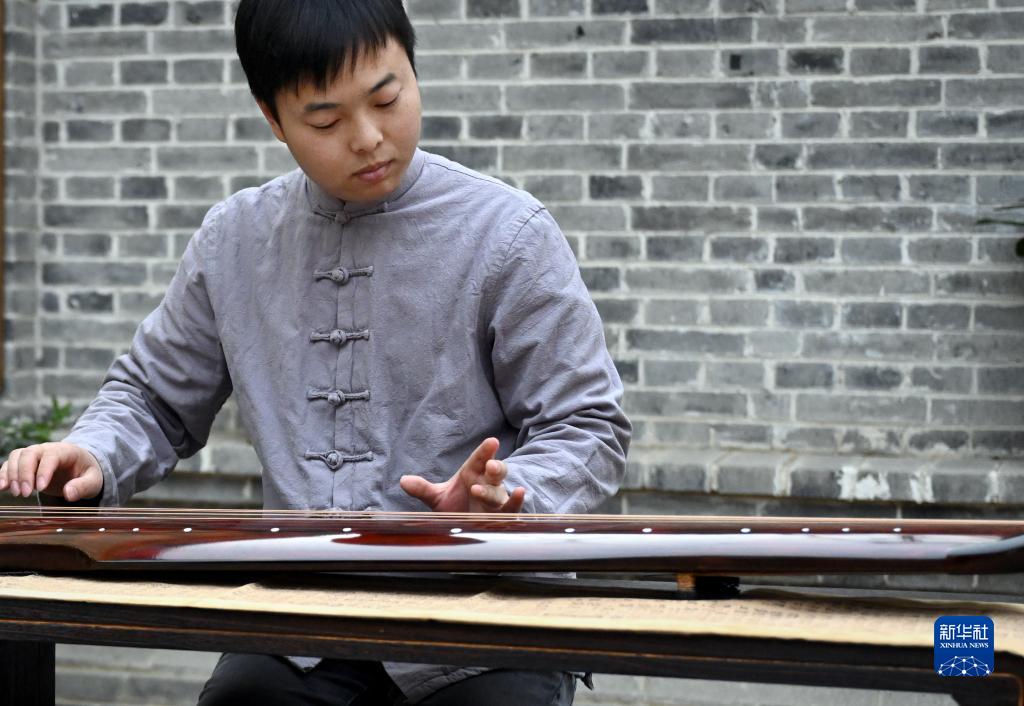 在兰考县堌阳镇徐场村墨武琴坊里,斫琴师徐亚冲在弹奏古琴(2月16日摄)。