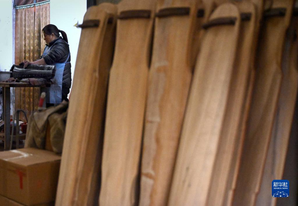 在兰考县堌阳镇徐场村的一处民族乐器家庭作坊里,村民在制作古琴(2月16日摄)。徐场村105户村民里,90余户都从事民族乐器加工制作,村内形成原材料加工、产品及配件制作、包装为一体的产业链。