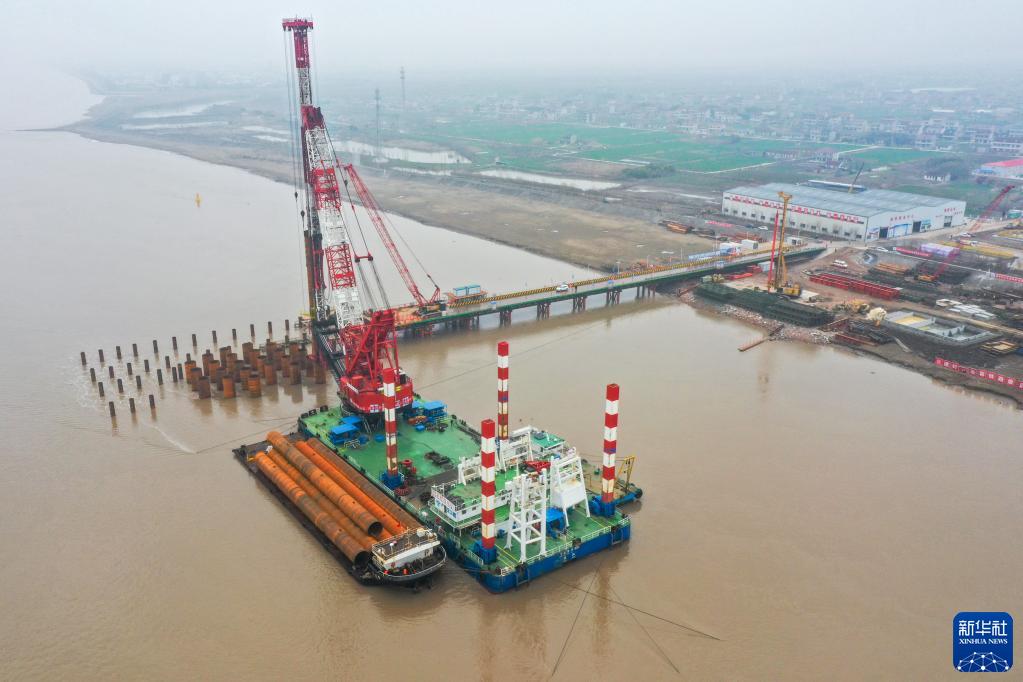 这是2月18日拍摄的崇启公铁长江大桥永久钢护筒施打作业现场(无人机照片)。
