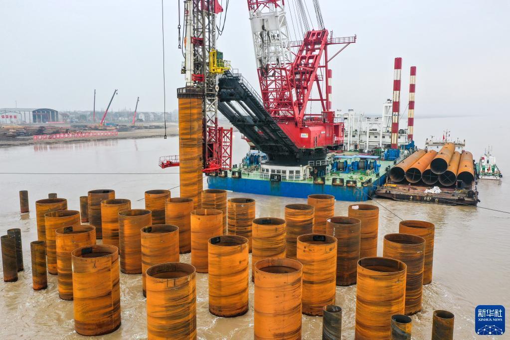 这是2月18日拍摄的崇启公铁长江大桥永久钢护筒施打作业现场(无人机照片)。