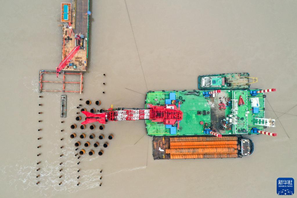 这是2月18日拍摄的崇启公铁长江大桥永久钢护筒施打作业现场(无人机照片)。