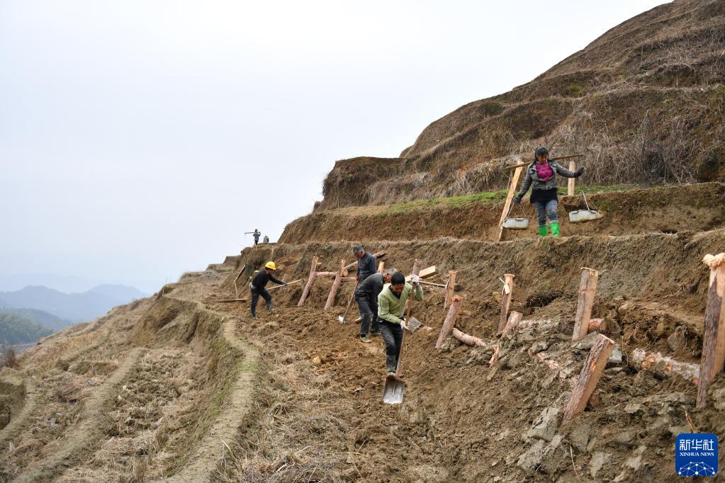时值春耕备耕时节,湖南省新化县水车镇紫鹊界村村民们抓紧时间修整紫鹊界梯田,为农忙做准备。