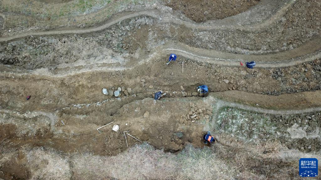 2月18日,村民在紫鹊界梯田夯实梯壁(无人机照片)。