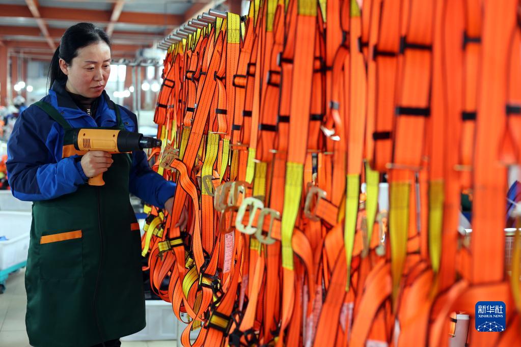 2月18日,山东省滨州市惠民县姜楼镇一家绳网企业工人在修整出厂的安全带。