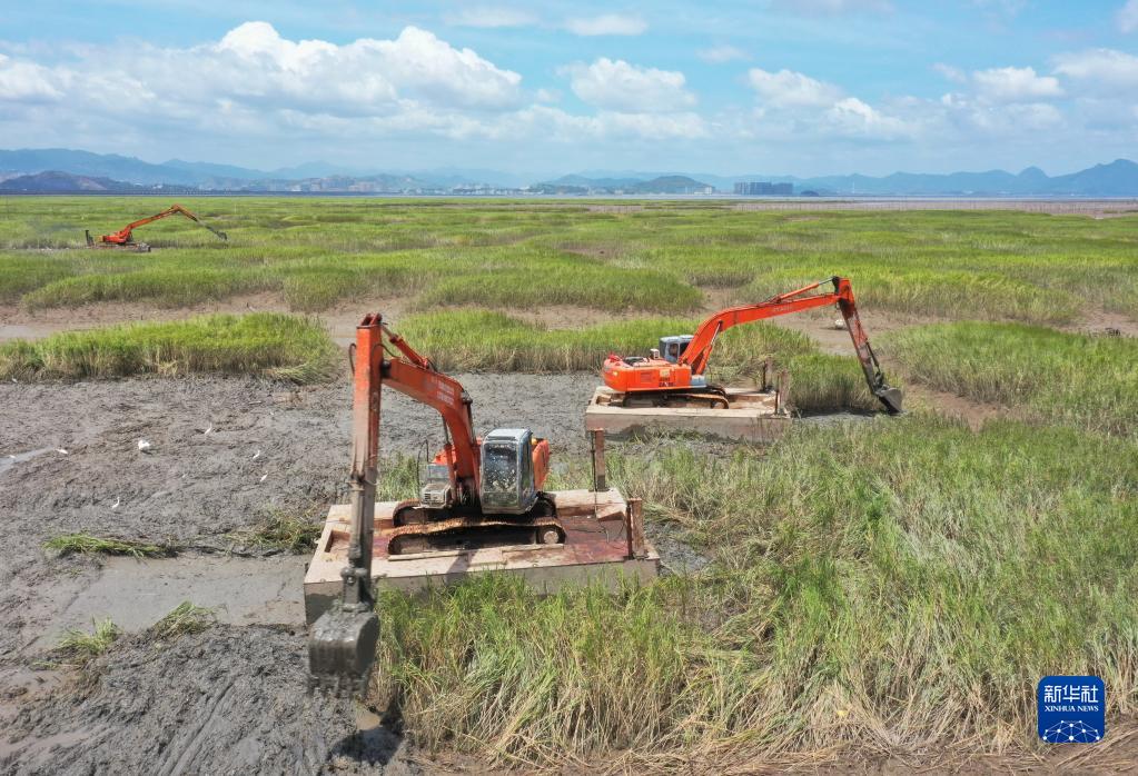 这是在宁德市蕉城区飞鸾镇附近拍摄的互花米草整治现场(无人机照片,2022年8月24日摄)。