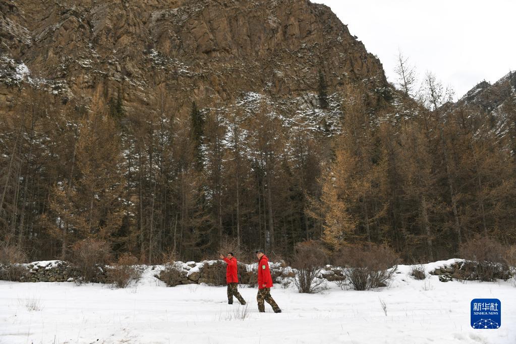 2月17日,哈拉乌管理站副站长李东(左)与管护员达来在保护区内巡护。