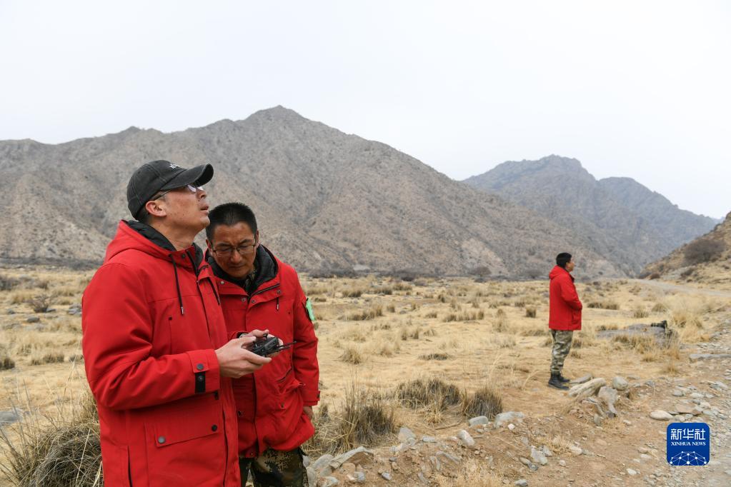 2月17日,哈拉乌管理站管护员达来(左)利用无人机开展巡护。