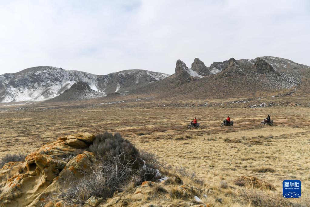 2月17日,哈拉乌管理站门洞子管护站的管护员驾驶摩托车在保护区内巡护。