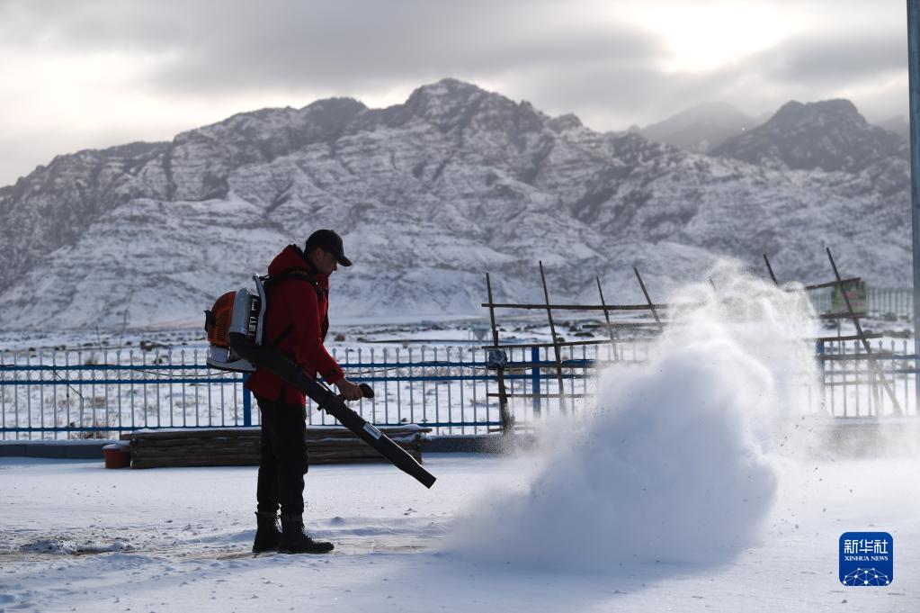 2月18日,哈拉乌管理站的管护员使用鼓风机清理积雪。