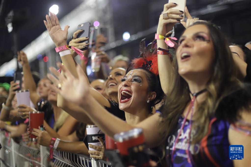 2月17日晚,人们在巴西圣保罗市阿年比桑巴大道观看狂欢节表演。