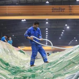 2月17日,在酒泉经济技术开发区的一家风电叶片制造企业,工人在风机叶片生产线为叶片灌注做准备。