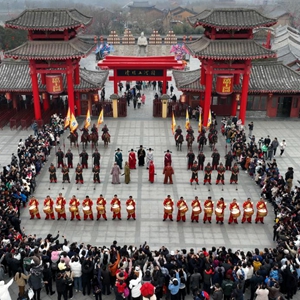 2月18日,游客在开封清明上河园景区观看民俗表演(无人机照片)。