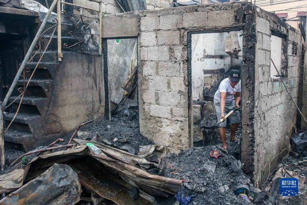 2月19日,菲律宾奎松的居民清理被烧毁的房屋。