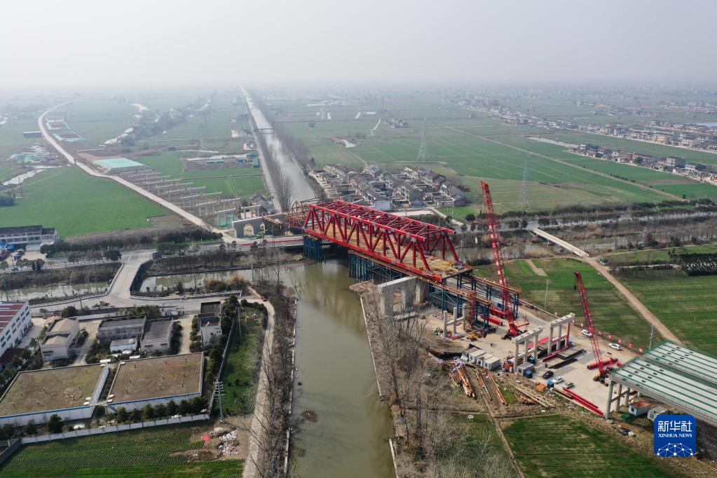 2月19日拍摄的中铁二十局常泰长江大桥南北公路接线工程跨G345特大桥钢桁梁顶推作业现场(无人机照片)。