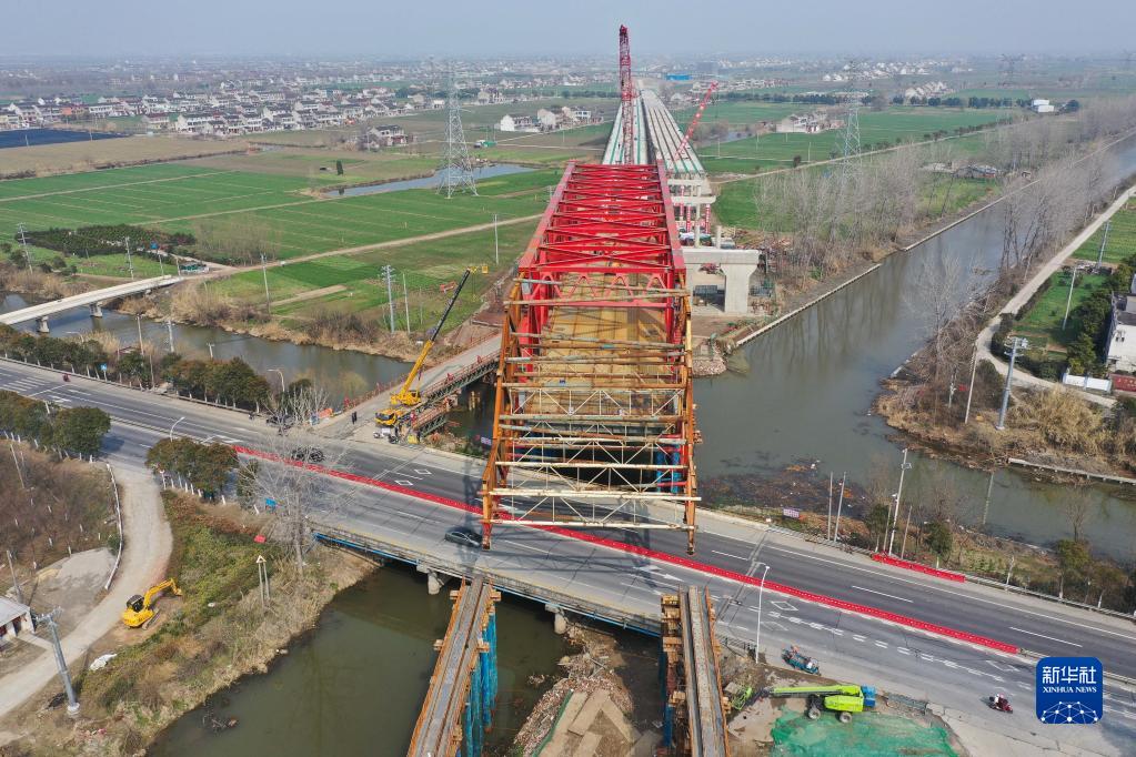 2月19日拍摄的中铁二十局常泰长江大桥南北公路接线工程跨G345特大桥钢桁梁顶推作业现场(无人机照片)。