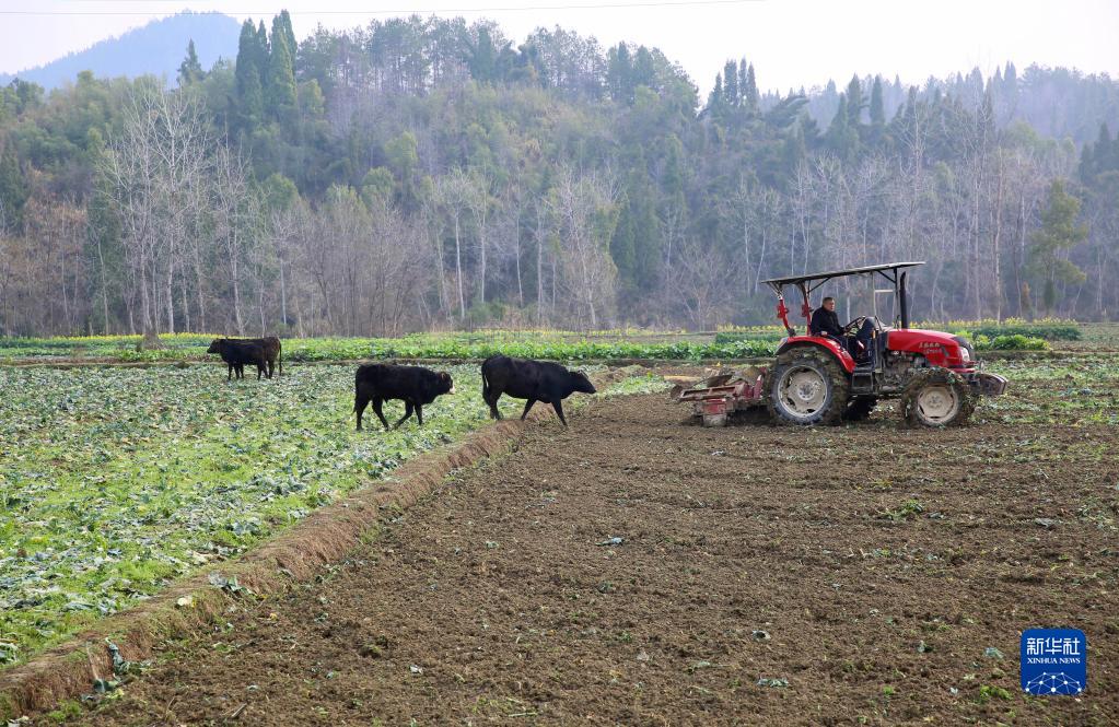 2月19日,在湖南省邵阳市隆回县花门街道太平洲村,村民驾驶农机翻耕农田。