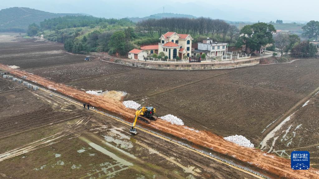 2月19日,施工人员在常宁市三角塘镇塘冲村高标准农田建设现场修建排水渠(无人机照片)。
