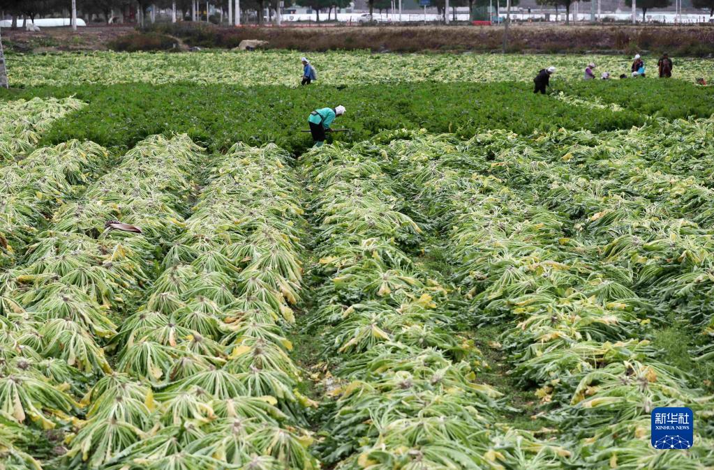2月19日,村民在贵州省黔东南苗族侗族自治州榕江县古州镇车江大坝采收雪里蕻。