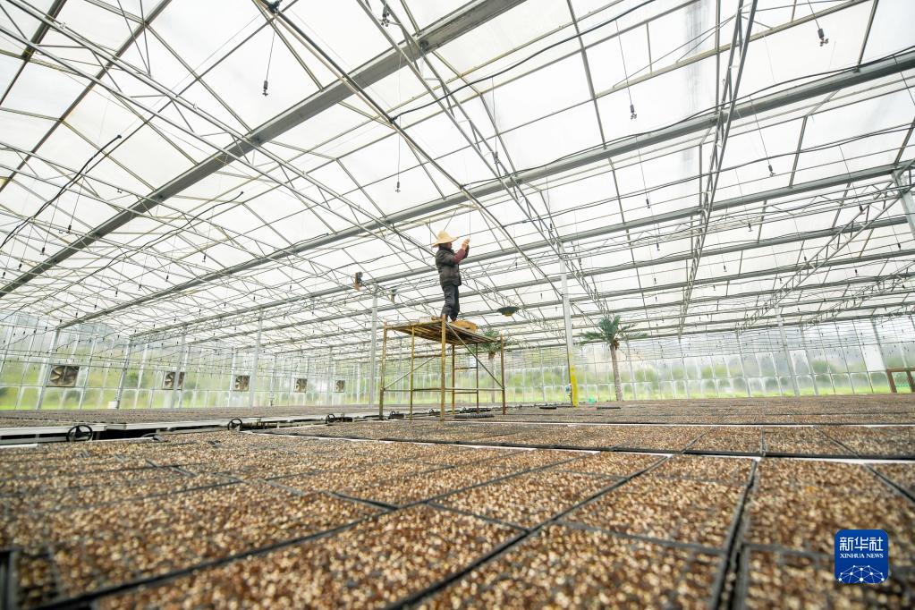 2月18日,村民在贵州省遵义市辣椒智慧产业园智能大棚安装自动喷水装置。