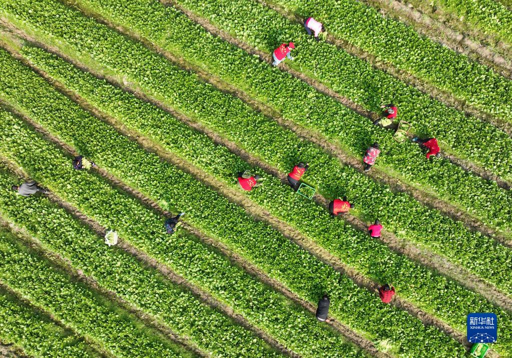 2月20日,湖南省衡阳市衡山县开云镇世上村村民在地里采收甜菜心(无人机照片)。