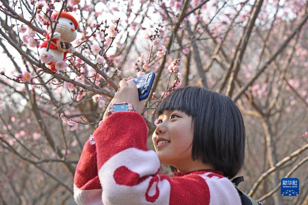 2月19日,小学生在安徽淮南市舜耕山风景区梅园内拍照。