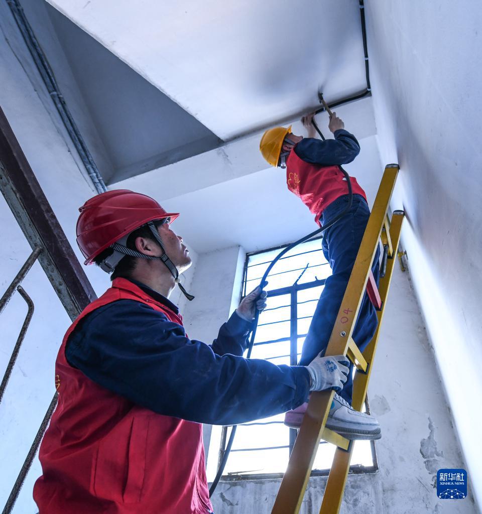 2月20日,在余姚市古建小区,余姚市大城小爱公益服务中心的志愿者在楼道内安装线路。