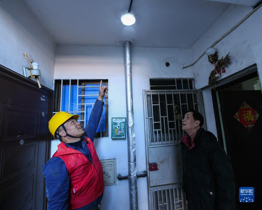 2月20日,在余姚市古建小区,余姚市大城小爱公益服务中心的志愿者向居民展示亮起来的感应灯。