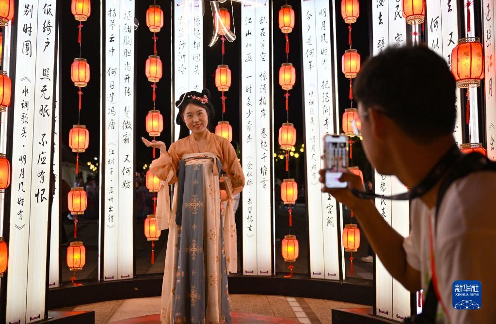 游客在海口日月广场的古风市集拍照留念(2月19日摄)。
