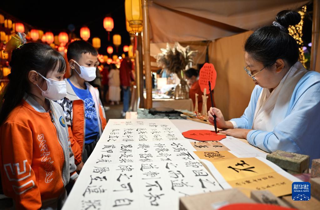 小朋友在海口日月广场的古风市集观看摊主展示书法技艺(2月19日摄)。