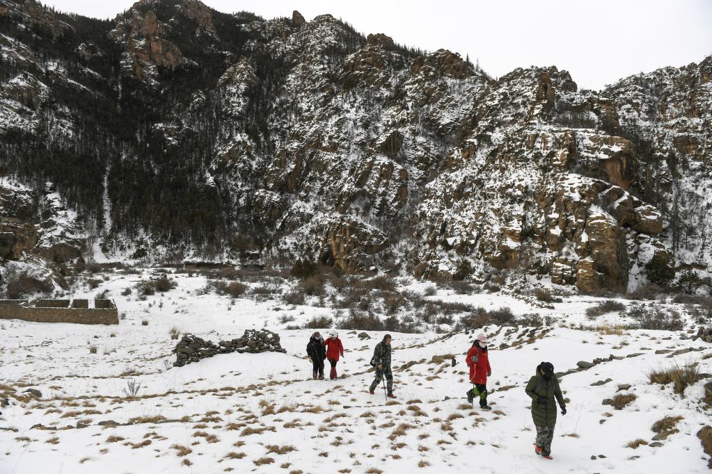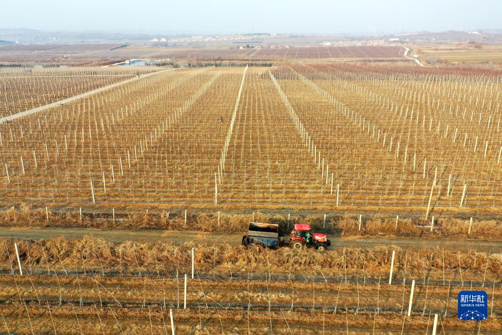 2月19日,在夏庄镇甲夼区域乡村振兴共富党建联盟一处现代化苹果产业基地内,村民在进行果树修枝、施肥作业(无人机照片)。