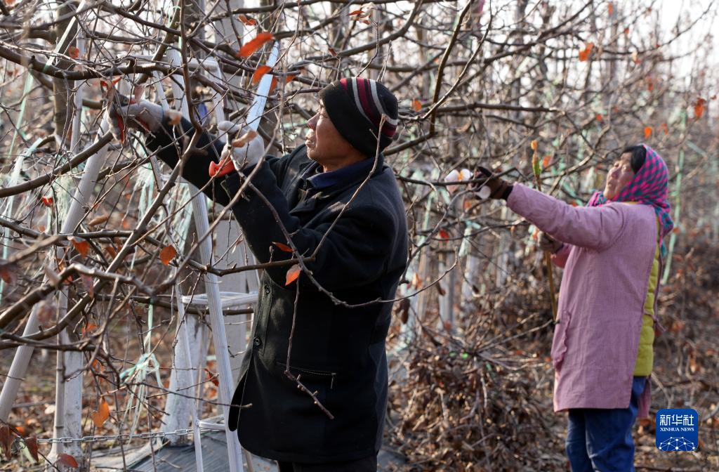 2月19日,在夏庄镇甲夼区域乡村振兴共富党建联盟一处现代化苹果产业基地内,村民在进行果树修枝作业。