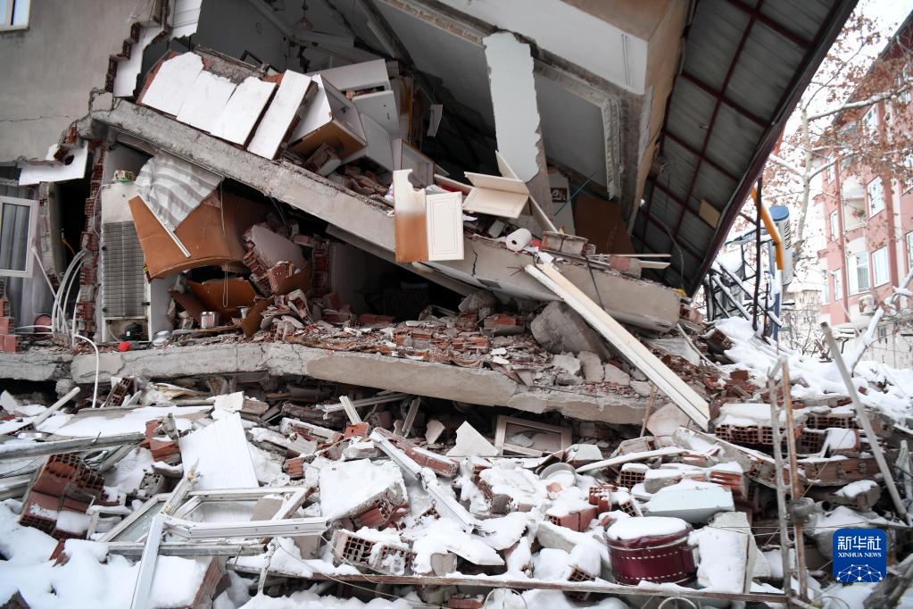 这是2月7日在土耳其卡赫拉曼马拉什省南部的埃尔比斯坦地区拍摄的地震中受损的建筑物。