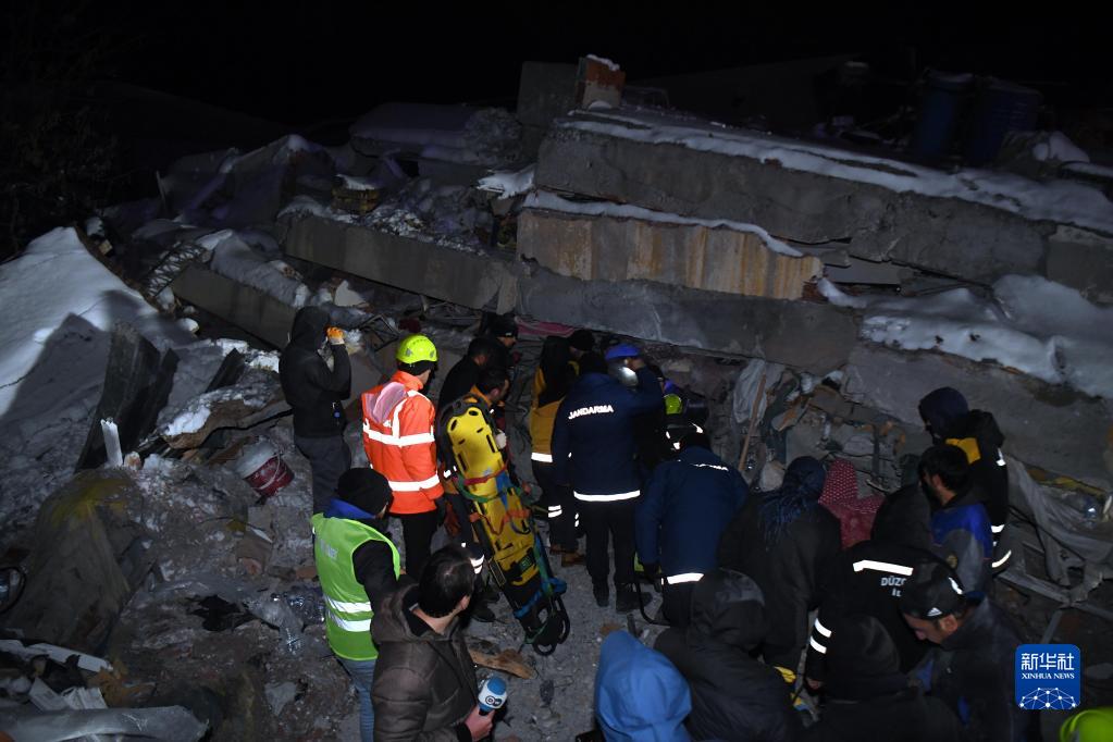 2月7日,救援人员在土耳其卡赫拉曼马拉什省南部的埃尔比斯坦地区开展地震救援工作。