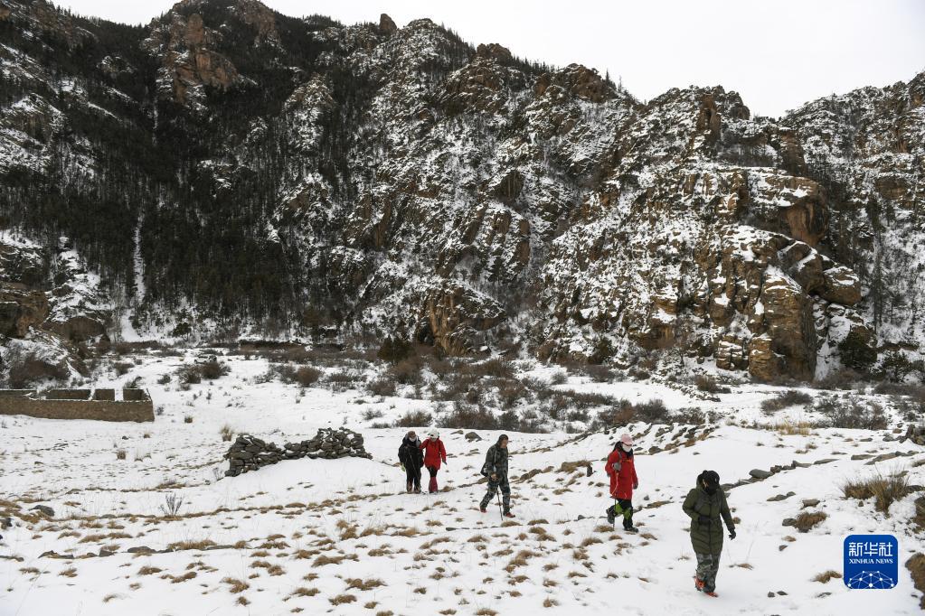 2月20日,工作人员行走在内蒙古贺兰山国家级自然保护区内。