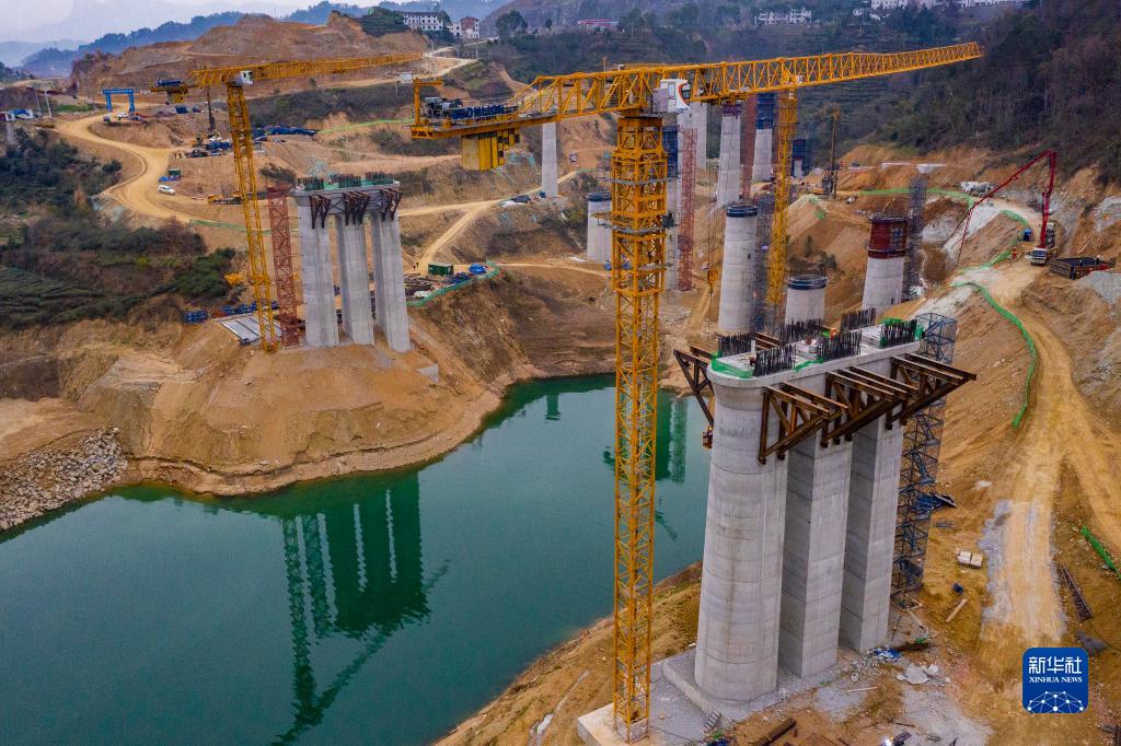 2月20日,工人在三峡库区湖北省宜昌市秭归县三峡枢纽茅坪港疏港铁路建设工地施工(无人机照片)。