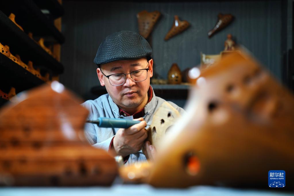 2月20日,陶笛艺人侯义敏在制作木质陶笛。