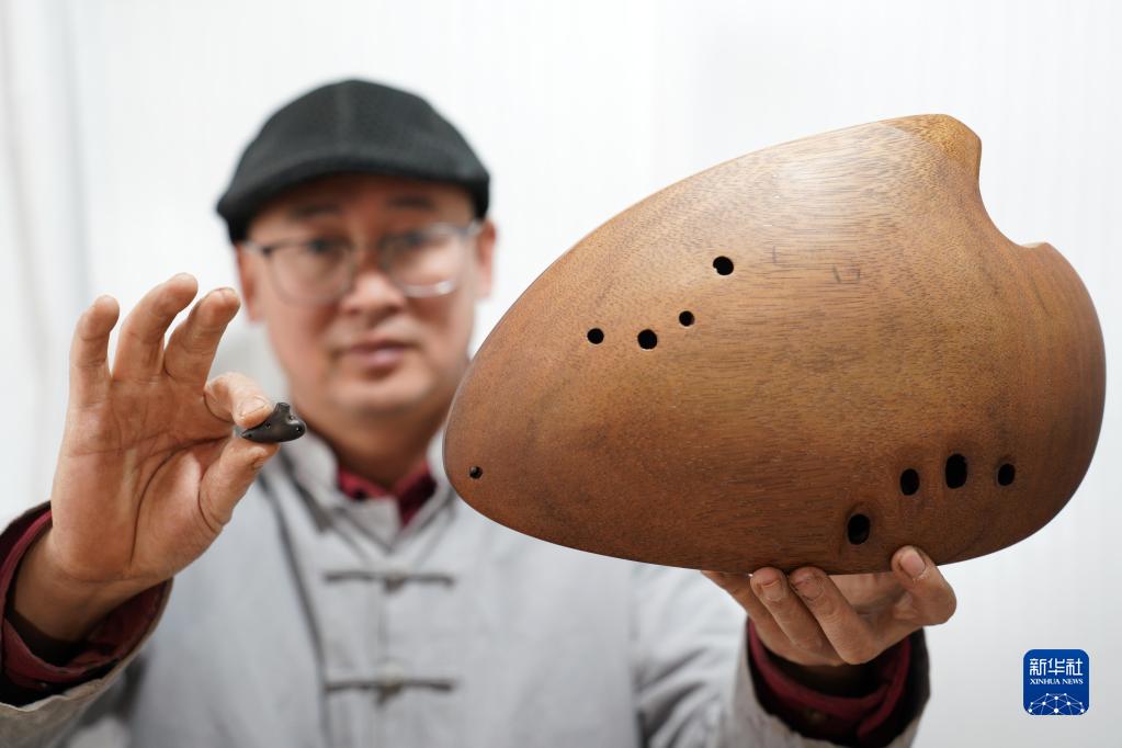 2月20日,陶笛艺人侯义敏在展示自己制作的大小各异的木质陶笛。