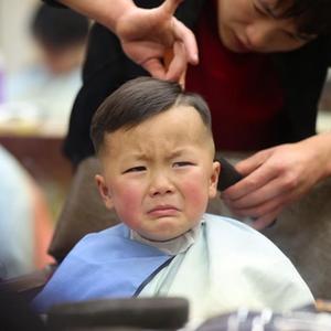 2月21日,理发师在山东省滕州市一家母婴生活馆为小朋友理发。