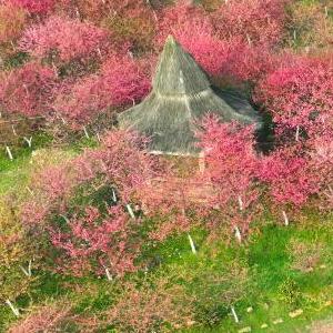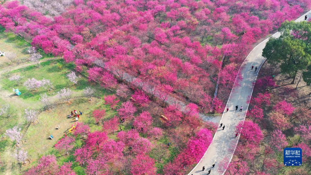 2月21日,游客在常宁市罗桥镇庙山村樱花园赏樱游玩(无人机照片)。