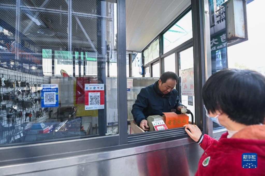 2月20日,在杭州市西湖区灵隐街道东山弄社区路口,配钥匙的师傅在社区提供的服务亭内给居民配钥匙。该社区常住人口8000多人,近年来为方便辖区居民群众,在小区公共点位安排了修雨伞、补鞋、配钥匙、修钟表摊位,并免去摊位租金。