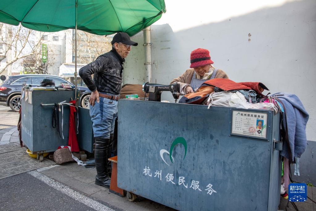 2月21日,在杭州市西湖区北山街道便民服务摊位,裁缝师陆卫芝(右)为社区居民修补衣物。北山街道帮助辖区内6处便民服务摊位统一办理了杭州市便民服务证,方便他们为老城区内的居民提供便民服务。