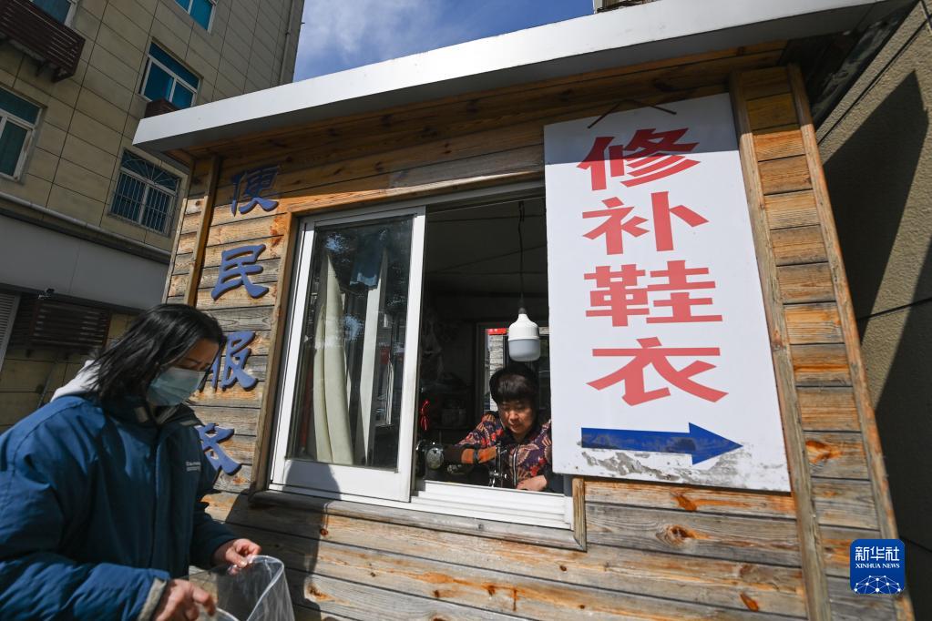 2月21日,邱芝英(右)在浙江省杭州市富阳区银湖街道高桥社区的便民服务亭内给居民缝补裤子。该便民服务亭由社区提供,免租金和水电费,同时还组织党员志愿者定期进行周边环境保洁。银湖街道在打造现代社区的过程中,设置多个“小修小补”便民服务亭,积极打造便民生活圈、满足居民日常生活需求。