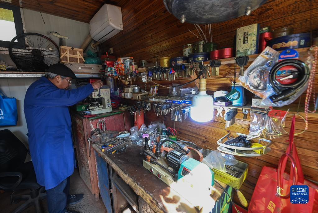 2月21日,方木根在浙江省杭州市富阳区银湖街道高桥社区的便民服务亭内给居民配钥匙。该便民服务亭由社区提供,免租金和水电费,同时还组织党员志愿者定期进行周边环境保洁。银湖街道在打造现代社区的过程中,设置多个“小修小补”便民服务亭,积极打造便民生活圈、满足居民日常生活需求。
