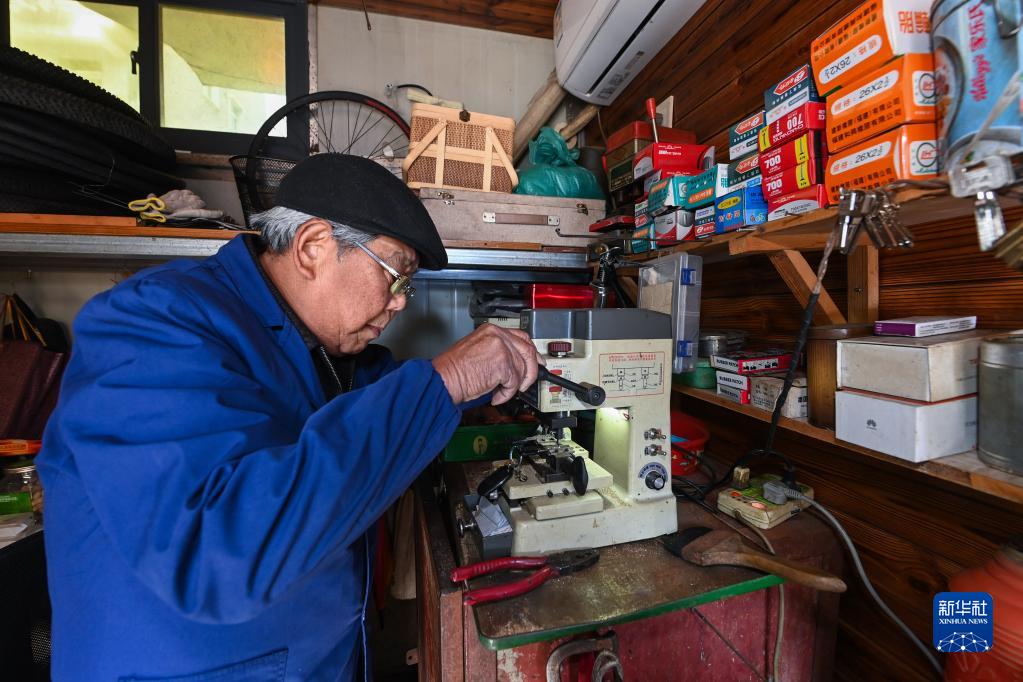 2月21日,方木根在浙江省杭州市富阳区银湖街道高桥社区的便民服务亭内给居民配钥匙。该便民服务亭由社区提供,免租金和水电费,同时还组织党员志愿者定期进行周边环境保洁。银湖街道在打造现代社区的过程中,设置多个“小修小补”便民服务亭,积极打造便民生活圈、满足居民日常生活需求。
